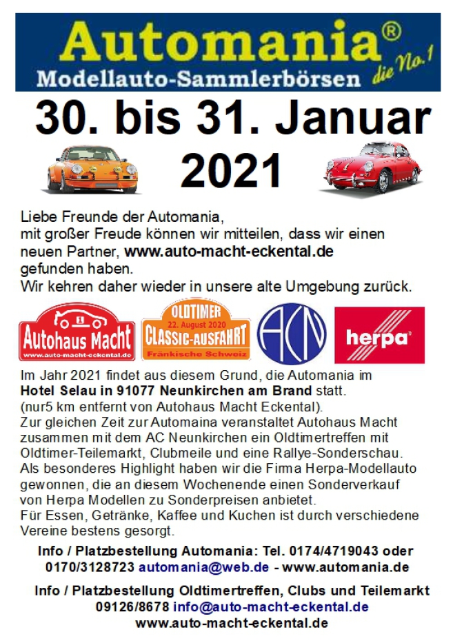 Genaue Infos zum Ablauf folgen in kürze. Es wird ein Megaevent mit der Modellautobörse, vielen Clubs, Vereinen, Firmen im Oldtimerbereich und Teileverkäufern.